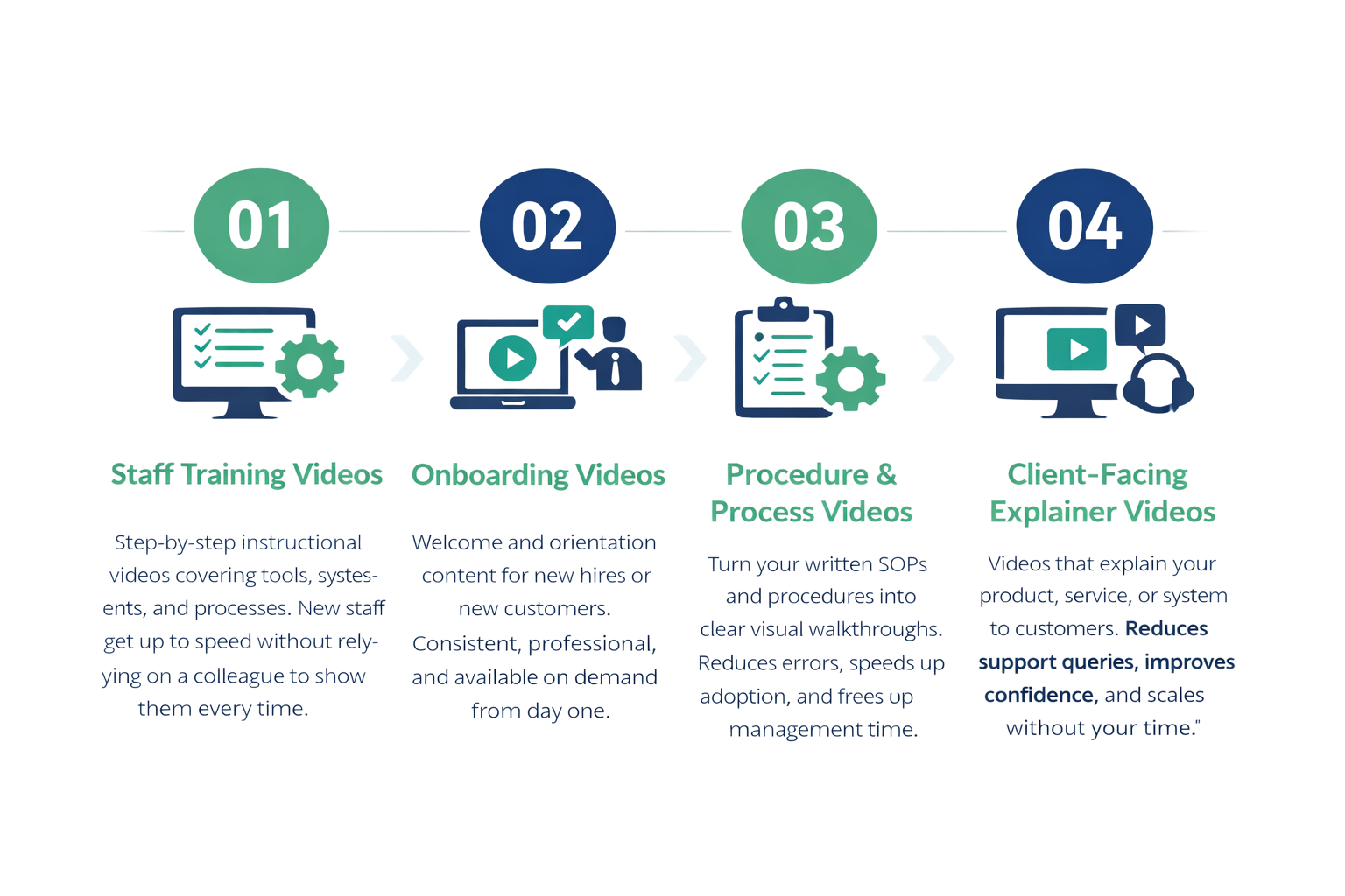 Professional training and onboarding videos. No crew. No studio. No cameras. A fraction of the cost.
